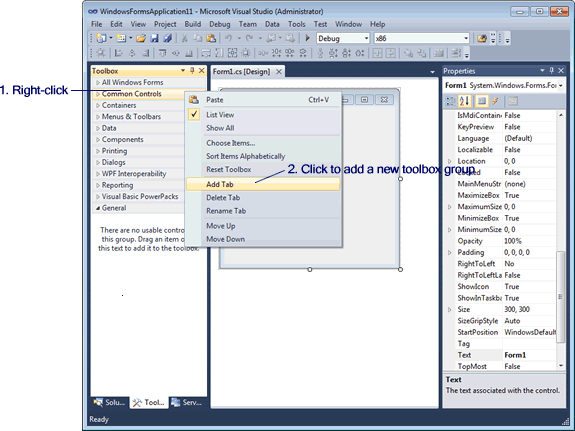 Open a form in your project in design view. Right-click anywhere on the Toolbox and select "Add Tab" from the popup menu.