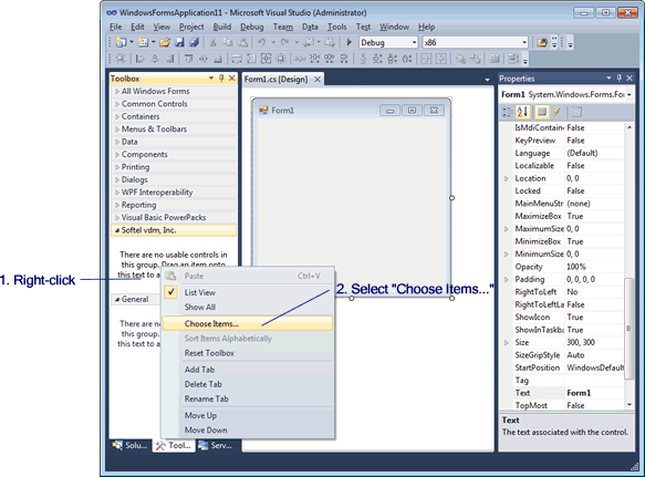 The controls are automatically added to the Visual Studio Toolbox during installation of SftBox/OCX and are located in the toolbox group "Softel vdm, Inc.", except for Visual Studio .NET 2002 and all Visual Studio Express Editions. For these, the controls have to be added "manually" using the following simple procedure.