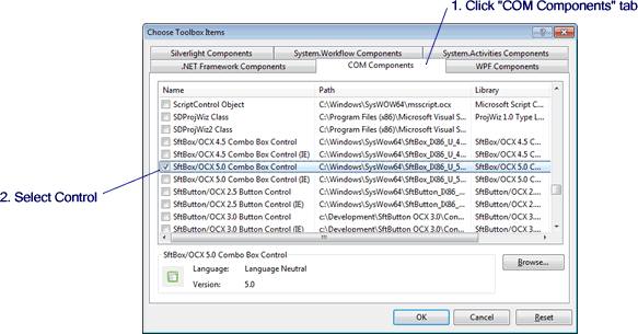 This will present the Choose Toolbox Items dialog, which is used to locate the ActiveX control you want to add.