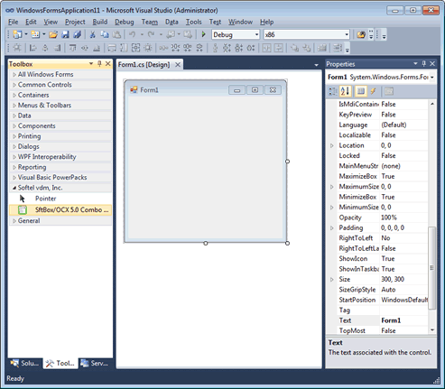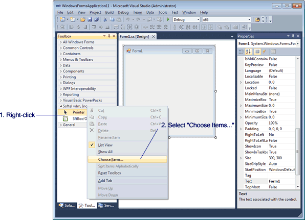 For Visual Studio 2003 and above, the controls are automatically added to the Visual Studio Toolbox in the toolbox group named "Softel vdm, Inc." and this section can be skipped. Otherwise, the SftBox/OCX control must be added to the toolbox before it can be used in a project.