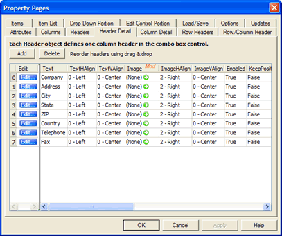 The second property page type displays multiple objects, all of the same type. Each item (or line) in the grid represents one object. The following shows the Header Detail page. Each line represents one SftBoxHeader object, indexed by column number. The index is shown at the beginning of the item (a gray button with the index number).