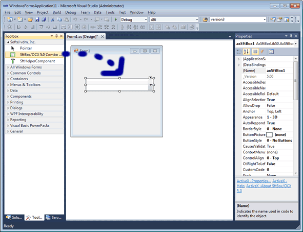 When adding SftBox/OCX to a project, Visual Studio .NET generates a class wrapper to fully support an ActiveX control such as SftBox/OCX. Unfortunately, this class wrapper is slightly incomplete and generates initially unexpected function names for certain properties. However, these issues are easily resolved.