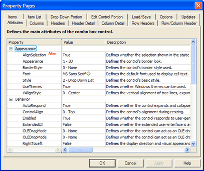 Usually, development tools allow access to the Property Pages implemented by a control. For example, Visual Basic allows you to right-click on the control in design mode. By selecting Properties from the popup menu presented, the properties can be accessed using the Property Pages provided by the control. The following tabs are offered by this property dialog. Additional tabs may be added to the dialog by your development tool.