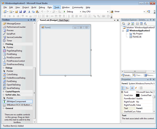 For Visual Studio 2003 and above the controls are automatically added to the Visual Studio Toolbox in the toolbox group named "Softel vdm, Inc." and this section can be skipped. Otherwise, the SftButton/OCX control must be added to the toolbox before it can be used in a project.
