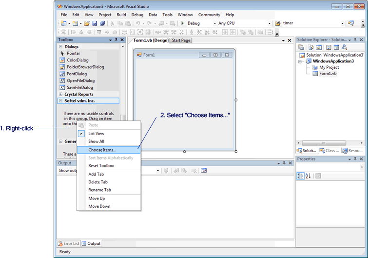 The controls are automatically added to the Visual Studio Toolbox during installation of SftButton/OCX and are located in the toolbox group "Softel vdm, Inc.", except for Visual Studio .NET 2002 and all Visual Studio Express Editions. For these, the controls have to be added "manually" using the following simple procedure.