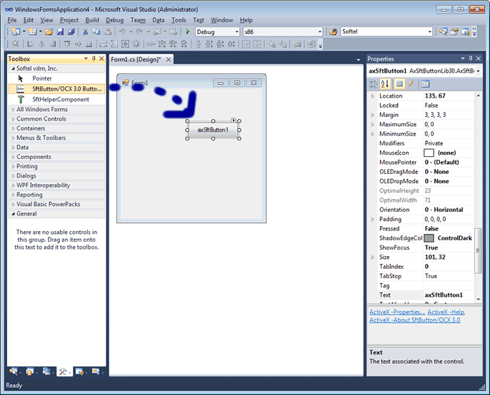 When adding SftButton/OCX to a project, Visual Studio .NET generates a class wrapper to fully support an ActiveX control such as SftButton/OCX. Unfortunately, this class wrapper is slightly incomplete and generates initially unexpected function names for certain properties. However, these issues are easily resolved.
