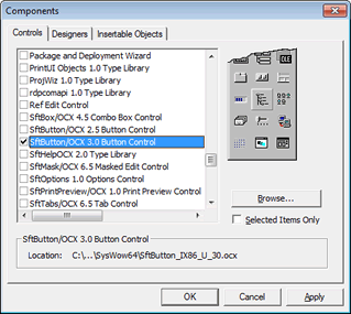 This adds the control to the Toolbox. If you don't see the control in the list, make sure Selected Items Only is not checked. Once you click Apply or OK and an error message is displayed, the product SftButton/OCX is not correctly installed or the control may have been unregistered accidentally. Quit Visual Basic and use the entry Maintenance, Register SftButton OCX in Windows Registry in the SftButton OCX 3.0 program group to register the control. Restart Visual Basic and try to add the control to the Toolbox again.