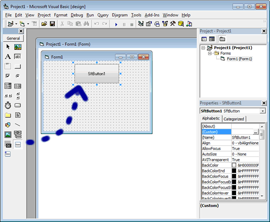 Now the control can be added to a form by clicking on the SftButton/OCX button of the Toolbox.