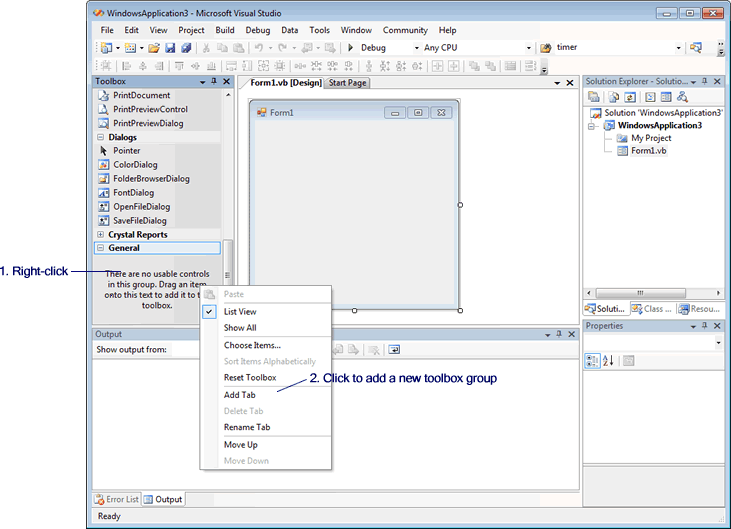 Open a form in your project in design view. Right-click anywhere on the Toolbox and select "Add Tab" from the popup menu.