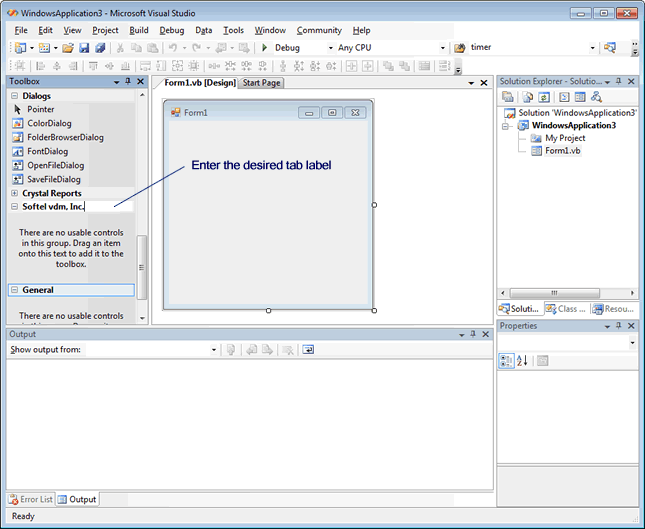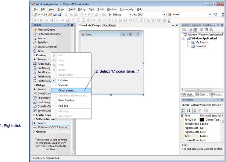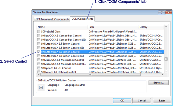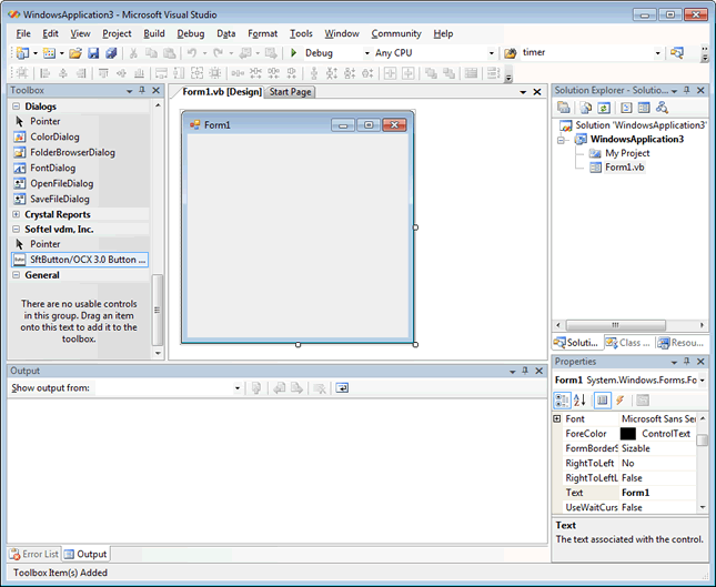 For Visual Studio 2003 and above the controls are automatically added to the Visual Studio Toolbox in the toolbox group named "Softel vdm, Inc." and this section can be skipped. Otherwise, the SftButton/OCX control must be added to the toolbox before it can be used in a project.