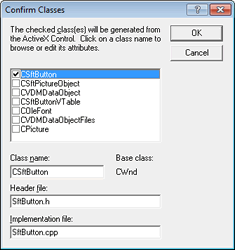 This will add the C++ wrapper classes needed to access SftButton/OCX. You are prompted to confirm this by clicking OK. A number of C++ classes are generated for each object class supported by SftButton/OCX. The only wrapper class that is needed is the class CSftButton/OCX (based on the control's IDispatch interface). It is only needed to define the SftButton/OCX control. Any other C++ classes generated can be discarded and are not used.
