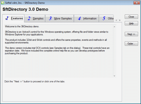 This demo application shows some of the features available in SftDirectory. It is also used to access other samples included in the demo or product and the online help.