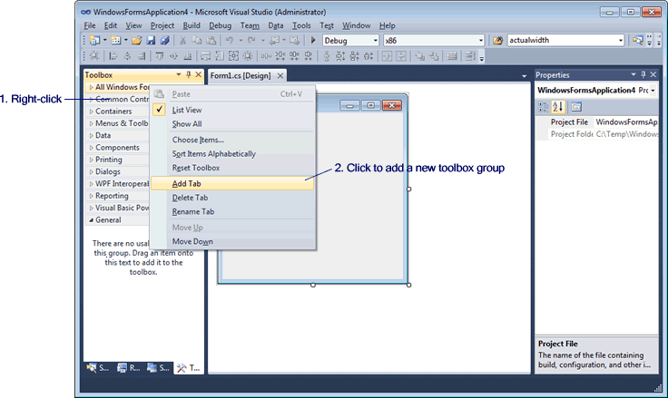 Open a form in your project in design view. Right-click anywhere on the Toolbox and select "Add Tab" from the popup menu.