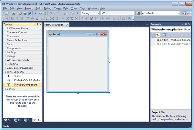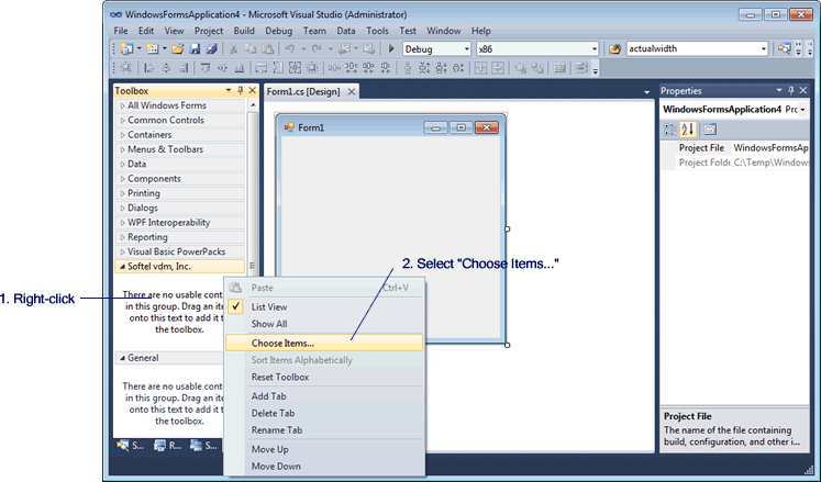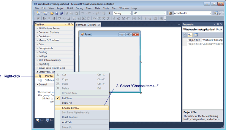 The controls are automatically added to the Visual Studio Toolbox during installation of SftMask/OCX and are located in the toolbox group "Softel vdm, Inc.", except for Visual Studio .NET 2002 and all Visual Studio Express Editions. For these, the controls have to be added "manually" using the following simple procedure.