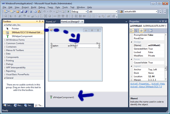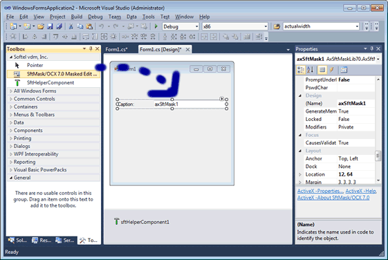When adding SftMask/OCX to a project, Visual Studio .NET generates a class wrapper to fully support an ActiveX control such as SftMask/OCX. Unfortunately, this class wrapper is slightly incomplete and generates initially unexpected function names for certain properties. However, these issues are easily resolved.