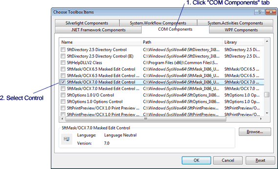 For Visual Studio 2003 and above the controls are automatically added to the Visual Studio Toolbox in the toolbox group named "Softel vdm, Inc." and this section can be skipped. Otherwise, the SftMask/OCX control must be added to the toolbox before it can be used in a project.