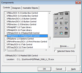This adds the control to the Toolbox. If you don't see the control in the list, make sure Selected Items Only is not checked. Once you click Apply or OK and an error message is displayed, the product SftMask/OCX is not correctly installed or the control may have been unregistered accidentally. Quit Visual Basic and use the entry Maintenance, Register SftMask OCX in Windows Registry in the SftMask/OCX 7.0 program group to register the control. Restart Visual Basic and try to add the control to the Toolbox again.