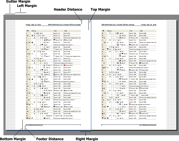 SftPrintPreview/DLL offers powerful page formatting features, with its margins, headers and footers. These are accessible to an end-user through the built-in Page Setup dialog. An application can control these through the SetControlInfo function.