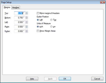 This modal dialog offers two pages, accessible via the tab control at the top, one page labeled "Margins" to modify the output's basic positioning. The other page labeled "Headers" defines the output's header and footer appearance.