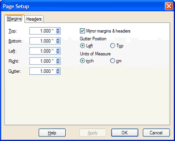 Left, top, right and bottom margins can be defined using the LeftMargin, TopMargin, RightMargin and BottomMargin properties. In addition, a "gutter" margin is available, which can be placed at the left or top of the page (see GutterMargin and GutterPosition properties). A gutter margin is useful when printing pages that are to be bound or two- and three-hole punched. The gutter margin provides extra space for such binding. If mirrored margins are selected (see MirrorMargins property), the gutter margin will alternate between left and right (or top and bottom) on the front and back of pages. The above picture shows the gutter margin as a shaded area (when printing or previewing, the gutter margin area is not shaded).