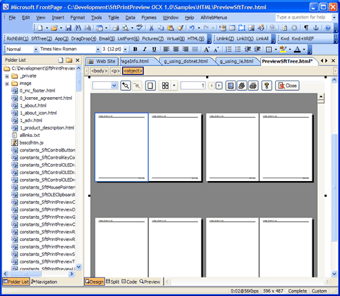 SftPrintPreview/OCX can be added to web pages. Using HTML design tools, such as Microsoft FrontPage or ActiveX Control Pad, SftPrintPreview/OCX can be added to a web page and controlled using a scripting language such as VBScript.