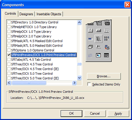 This adds the control to the Toolbox. If you don't see the control in the list, make sure Selected Items Only is not checked. Once you click Apply or OK and an error message is displayed, the product SftPrintPreview/OCX is not correctly installed or the control may have been unregistered accidentally. Quit Visual Basic and use the entry Maintenance, Register SftPrintPreview OCX in Windows Registry in the SftPrintPreview OCX 1.0 program group to register the control. Restart Visual Basic and try to add the control to the Toolbox again.