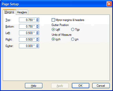 This modal dialog offers two pages, accessible via the tab control at the top, one page labeled "Margins" to modify the output's basic positioning. The other page labeled "Headers" defines the output's header and footer appearance.