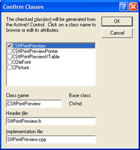 This will add the C++ wrapper classes needed to access SftPrintPreview/OCX. You are prompted to confirm this by clicking OK. A number of C++ classes are generated for each object class supported by SftPrintPreview/OCX. The only wrapper class that is needed is the class CSftPrintPreview/OCX (based on the control's IDispatch interface). It is only needed to define the SftPrintPreview/OCX control. Any other C++ classes generated can be discarded and are not used.