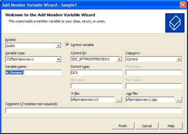 This will add the C++ wrapper classes needed to access SftPrintPreview/OCX. A number of C++ classes are generated for each object class supported by SftPrintPreview/OCX. The only wrapper class that is needed is the class CSftPrintPreview/OCX (based on the control's IDispatch interface). It is only needed to define the options control. Any other C++ classes generated can be discarded and are not used.