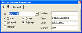 To define a SftTabs/DLL control, enter the class SftTabsControl60 in the edit field labeled Class. A window caption is not necessary, so the edit field marked Caption can be left blank.