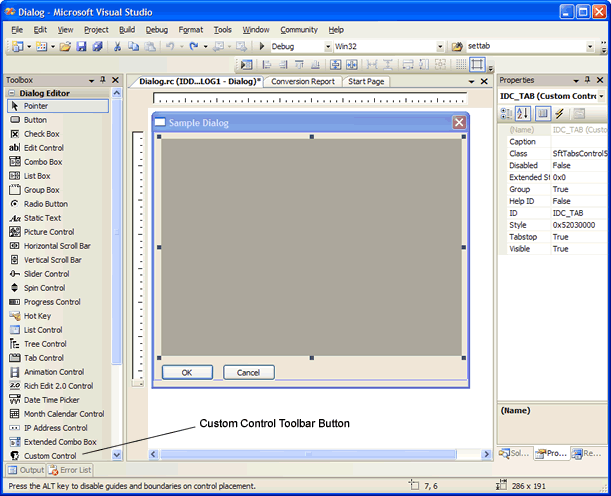 To add a SftTabs/DLL control to a dialog, use the "Custom Control" toolbar button. Click on the button and then the dialog being designed to add a control.