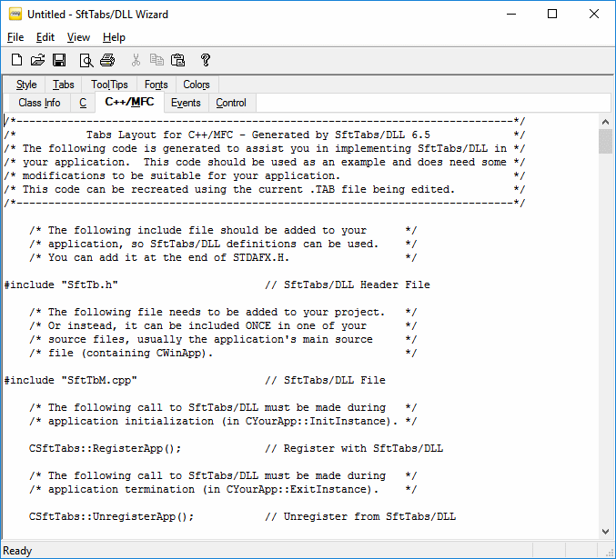 The sample source code generated using the C or C++/MFC tabs can be used to implement a tab control in an application. Usually the source code can be used with just minor modifications. By following the comments in this source code, the relevant sections can be copied to your application.