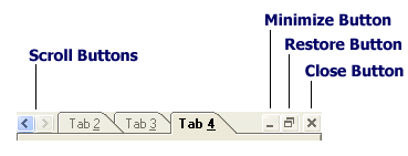 A tab control with a single row of tabs (Tabs.Rows) offers optional scroll buttons, a Minimize button, a Restore button and a Close button.