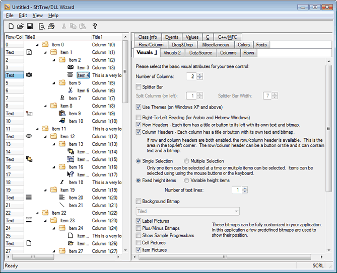 The SftTree/DLL Wizard application is used to design a tree control look. Most control attributes can be manipulated, except pictures and bitmaps. Sample pictures are provided by the SftTree/DLL Wizard and cannot be changed. Of course, an application can freely define its own pictures. Once the desired look has been achieved, the run-time source code used to initialize the tree control can be generated for C and C++/MFC by clicking on the corresponding tab. The generated source code contains step by step instructions on how to incorporate it into an application.