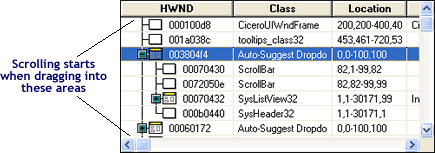 When dragging within the tree control, the drop target will automatically be updated and the data will automatically start scrolling vertically when the mouse cursor moves into the areas marked below. Once the mouse cursor goes beyond those areas, indicating a drag operation outside the tree control, scrolling stops automatically. No application program intervention is required for this to take place. A header or scroll bar is not required. This drag-scrolling support is identical to the drag-scrolling supported by OLE conventions.