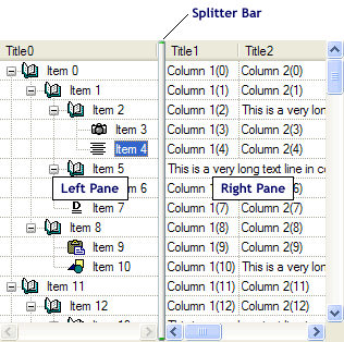 A split tree control is a tree control that has multiple columns and a splitter bar. The splitter bar is used to separate columns so the columns can be scrolled individually. Both the left and right panes can be scrolled horizontally. This is most useful to lock the first column while being able to scroll the remaining columns horizontally.