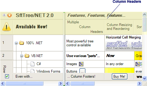 Optional column headers are available for single- and multi-column trees. Column headers consist of one or multiple rows of cells. Individual cells within the column headers can be accessed using the HeadersClass.Item property. Languages supporting indexers can use array syntax, usually Headers[] or Headers().