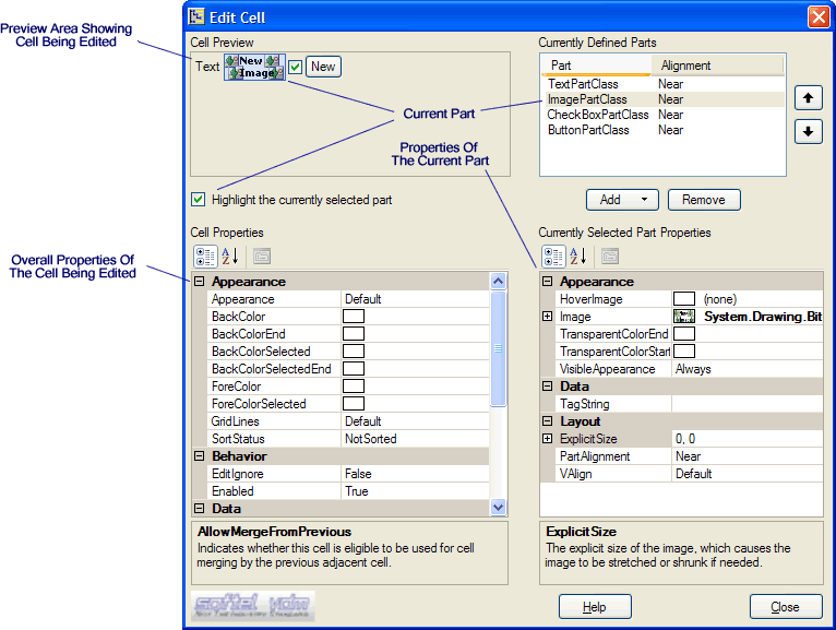 Cell contents can be defined using the property pages "Item", "Header Detail" and "Footer Detail". On these pages, right-click on a cell to display the Cell Edit Dialog.