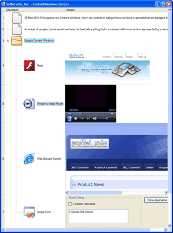 Each cell can contain a child window. This child window becomes the content for the cell and is displayed in its place. Possible examples of such content windows are Flash controls, Windows Media Player, Web Browser controls, dialogs, etc. Almost any type of control or window can be used provided it can be represented by a window handle HWND. SftTree/OCX automatically resizes, hides and disables content windows as needed.