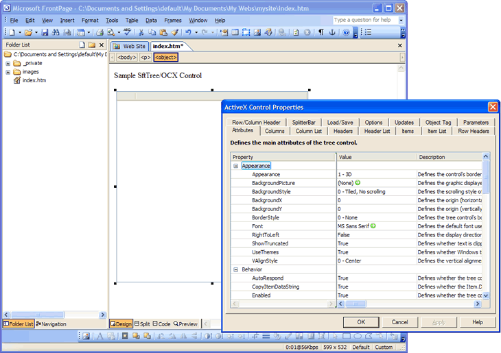 To design a web page with a SftTree/OCX control and to manipulate the control properties, a tool such as Microsoft's FrontPage or ActiveX Control Pad is used. A design-time version of SftTree/OCX (the file SftTree_IX86_I_75.ocx) is registered and used for this purpose.