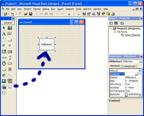 Now the control can be added to a form by clicking on the SftButton/OCX button of the Toolbox.