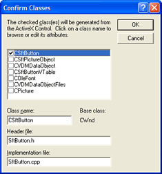 This will add the C++ wrapper classes needed to access SftButton/OCX. You are prompted to confirm this by clicking OK. A number of C++ classes are generated for each object class supported by SftButton/OCX. The only wrapper class that is needed is the class CSftButton/OCX (based on the control's IDispatch interface). It is only needed to define the SftButton/OCX control. Any other C++ classes generated can be discarded and are not used.