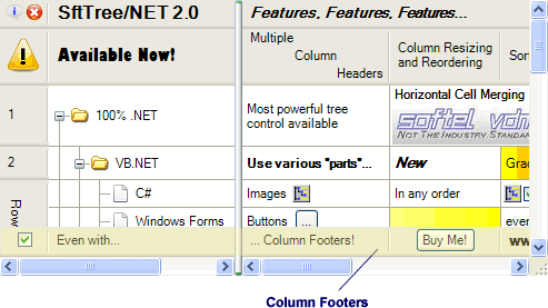 Optional column footers are available for single- and multi-column trees. Column footers consist of one or multiple rows of cells. Individual cells within the column footers can be accessed using the Footers.Item property. Languages supporting indexers can use array syntax, usually Footers[] or Footers().